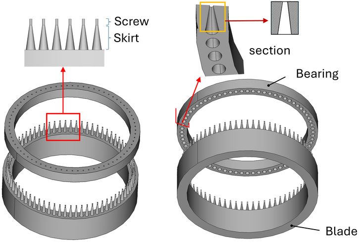 It's hard to insert bolts on Blade into the bolt holes of the Bearing because the clearance between a bolt and a bolt hole is so small ( ex. few mm).